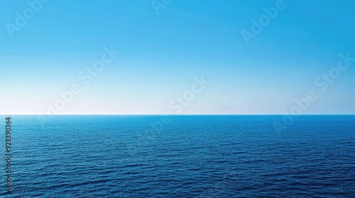 © Matcha_09, Obraz premium A panoramic shot of a blue sea with a distant horizon and a cloudless sky.