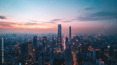© วรรณภา มะโนศรี, Fototapeta premium A panoramic shot of a dense urban skyline at dusk, with tall skyscrapers lit up against the darkening sky and a lively cityscape illuminated below.