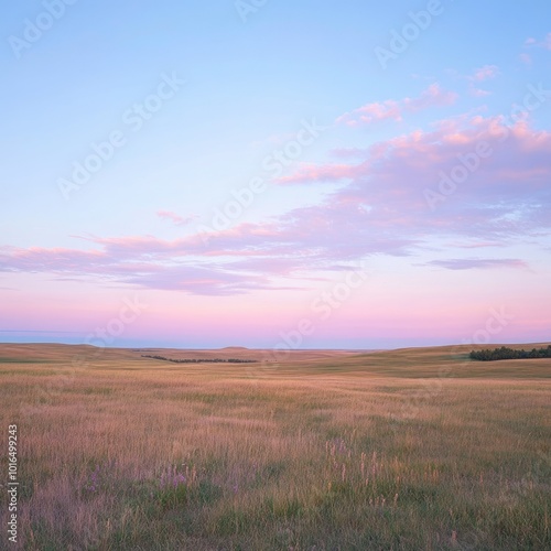 © Theeranan, Obraz premium A panoramic shot of a wide-open prairie at sunrise, with the sky painted in soft pastel hues and a distant tree line