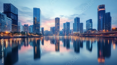 © phattharabodin, Fototapeta premium A panoramic shot of an urban skyline reflected in a river, with sleek modern skyscrapers and bridges in the background.