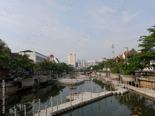 Obraz premium A panoramic shot of the Kali Besar river in Jakarta's Old Town, with the...