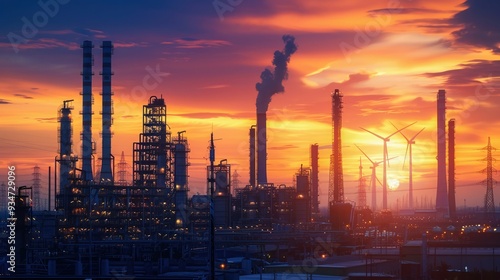 © sticker2you, Fototapeta premium A panoramic sunset view behind a clean energy factory