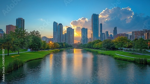 © Ta, Fototapeta premium A panoramic view highlights the new canal and towering skyscrapers, symbolizing urban development and innovation.