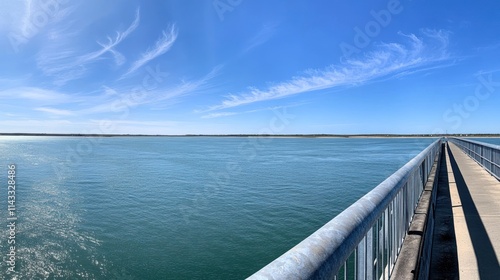 © yoga, Obraz premium A panoramic view of a calm waterway from a pier under a clear blue sky.