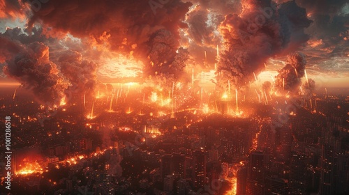 © Dennis, Naklejka premium A panoramic view of a city at night with multiple rocket explosions lighting up the sky, creating a scene of chaos and destruction