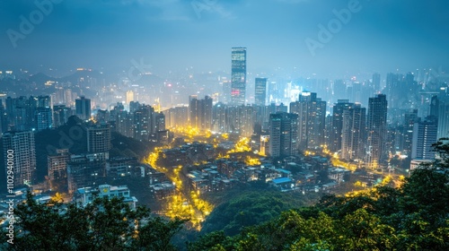 Obraz premium A panoramic view of a city skyline at dusk, illuminated by city lights amidst a misty atmosphere.