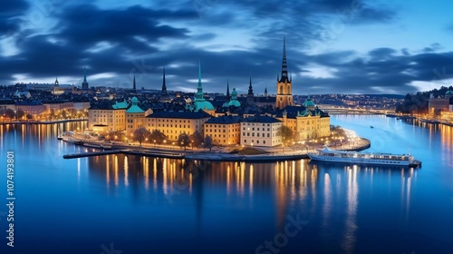 Obraz premium A panoramic view of a city skyline at dusk, reflecting lights on the water.