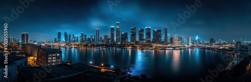 Fototapeta premium A panoramic view of a city skyline at night, reflecting on water.