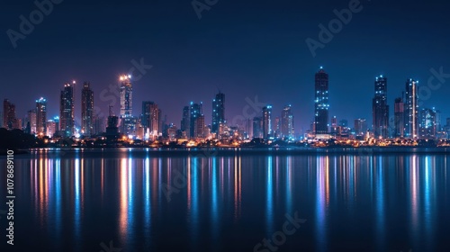 © amai line art, Fototapeta premium A panoramic view of a city skyline at night with illuminated skyscrapers reflecting on the water.