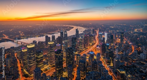 © Veayo, Obraz premium A panoramic view of a city skyline at sunset, featuring tall buildings, bridges, and a river.