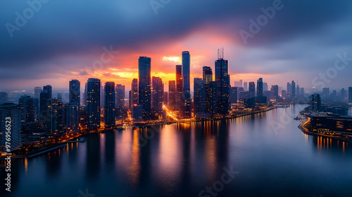 © Siasart Stock, Fototapeta premium A panoramic view of a city skyline with skyscrapers reflecting in the water at sunset.