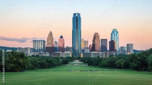 Obraz premium A panoramic view of a city skyline with tall buildings and a park in the...