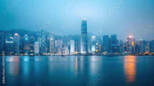 © JK_kyoto, Naklejka premium A panoramic view of a citys skyline at dusk, with glowing lights and no visual distractions