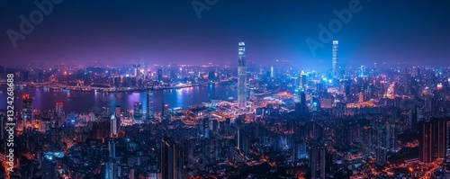© Preeti Frames, Fototapeta premium a panoramic view of a cityscape at night with illuminated skyscrapers and the river.