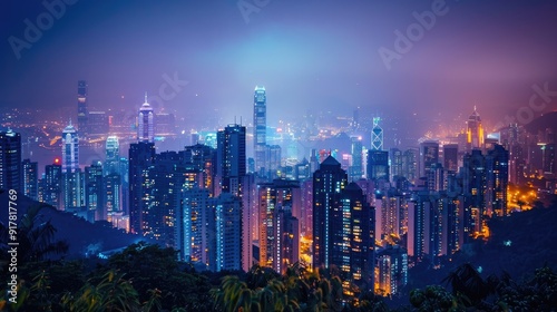 © NDmCX-Nic, Fototapeta premium A panoramic view of a cityscape at night, with tall buildings illuminated by colorful lights. The city skyline is shrouded in a light haze, creating a dreamy atmosphere.