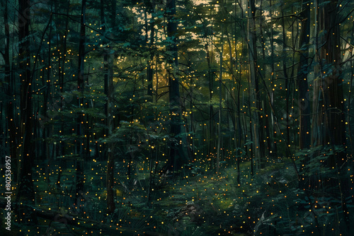 Obraz premium A panoramic view of a dense forest illuminated by the soft glow of fireflies.