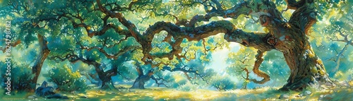 Fototapeta premium A panoramic view of a dense forest, with towering trees stretching into the...