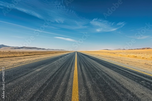 © Elmira, Fototapeta premium A panoramic view of a deserted asphalt road vanishing into the horizon, surrounded by a vast, dry desert landscape. The scene evokes a sense of solitude and isolation