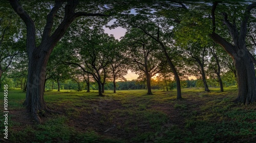 © Zulfa, Obraz premium A panoramic view of a forest at sunset, with the sun shining through the trees.