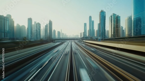 © orendesain99, Fototapeta premium A panoramic view of a highway in a bustling city, with blurred cars creating a sense of motion and speed. The tall buildings in the background create a majestic cityscape.