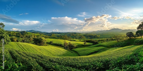 © Mehemmed, Fototapeta premium A panoramic view of a lush green field showcases the vibrant greenery and natural beauty of the landscape, highlighting the serenity found in this picturesque green field setting.