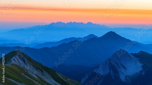 © Aleksandra, Obraz premium A panoramic view of a majestic mountain range during sunset with layers of colors in the sky and a serene valley below capturing the aweinspiring beauty of the natural landscape