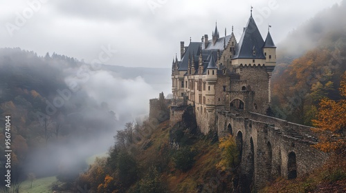 © Thirawat, Fototapeta premium A panoramic view of a medieval castle surrounded by a misty morning fog, creating a mystical and enchanting atmosphere.