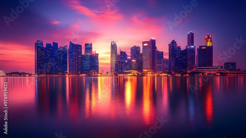 © Siasart Stock, Fototapeta premium A panoramic view of a modern city skyline at sunset with colorful reflections in the water.