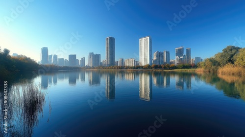 © Oatthapon, Obraz premium A panoramic view of a modern skyline with high-rise buildings reflecting in a calm river under a clear blue sky, capturing the architectural diversity and urban growth