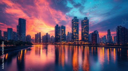 © Bashir, Fototapeta premium A panoramic view of a modern skyscraper cityscape at twilight, with illuminated windows and reflections in a nearby river under a vibrant sky.