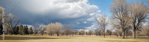 © Trionorejo, Obraz premium A panoramic view of a park with trees under a cloudy sky.