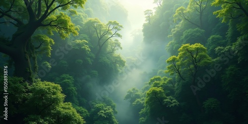 © Your Stock Studio, Fototapeta premium a panoramic view of a pine forest valley in early morning fog