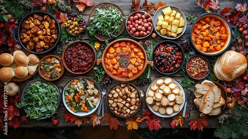 Fototapeta premium A panoramic view of a rustic autumn table spread, featuring a variety of roasted vegetables, hearty stews, and freshly baked bread, surrounded by colorful fall leaves. The warm,