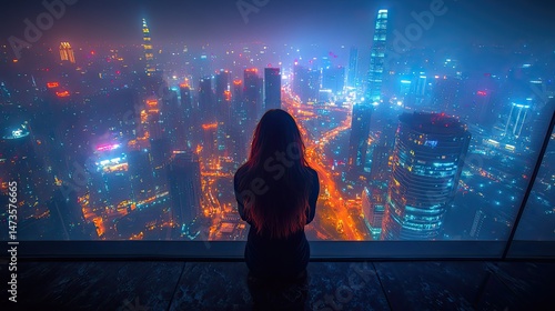 © Nguyen, Fototapeta premium A panoramic view of a sprawling cityscape at night, a dazzling array of lights illuminating the towering buildings, a testament to human ingenuity and progress