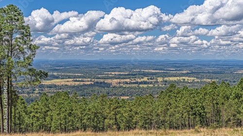 © Yakup, Fototapeta premium A panoramic view of a sprawling forest with a distant mountain range under a blue sky with white clouds