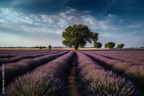© ankreative, Obraz premium A panoramic view of a sprawling lavender field, with a quaint French farmhouse in the distance. Ai generated.