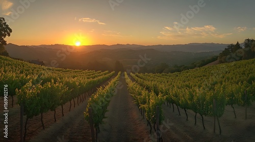 © ABC IMAGE, Naklejka premium A panoramic view of a sprawling vineyard with rows of grapevines stretching out under a golden sunset sky