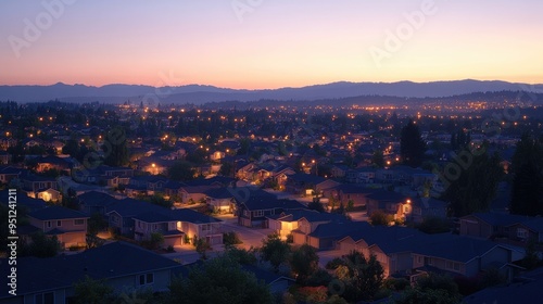 Obraz premium A panoramic view of a suburban neighborhood at dusk, with houses glowing...