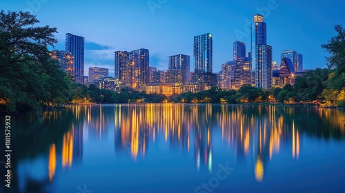 Naklejka premium A panoramic view of a vibrant city at dusk, the skyline glowing and reflecting in a tranquil lake