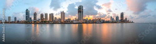 Fototapeta premium A panoramic view of a vibrant city skyline at sunset, reflecting on calm...