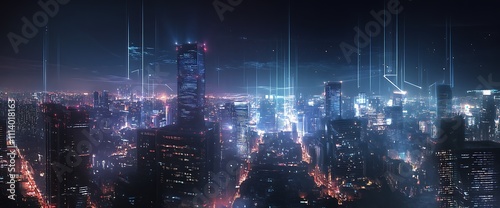 Obraz premium A panoramic view of a vibrant, futuristic city skyline at night, illuminated...