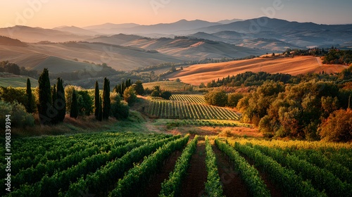 © Asawin, Naklejka premium A panoramic view of a vineyard in the countryside at sunset