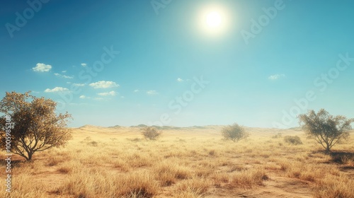 © Sampao, Fototapeta premium A panoramic view of an endless plain, with sparse trees dotting the landscape and the sun high in the sky.