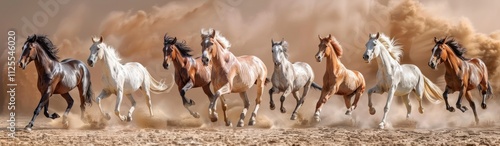 © Gajah, Obraz premium A panoramic view of an entire herd or race of horses running in the desert