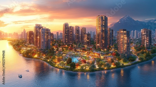Fototapeta premium A panoramic view of an urban riverside development with a mix of residential towers, commercial spaces, and public parks, highlighting the city's growth along the waterfront.