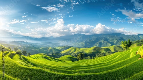 © IntelliArt, Fototapeta premium A Panoramic View Of Green Rice Fields With Mountains In The Background At Pa Pong Piang Rice Terraces