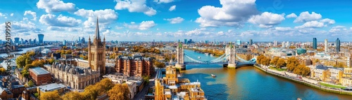 © WACHI, Fototapeta premium A panoramic view of London showcasing the River Thames, iconic architecture, and vibrant city life under a bright blue sky.