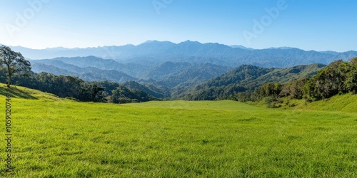 Fototapeta premium A panoramic view of lush green hills under a clear blue sky, showcasing the...