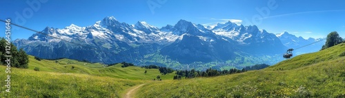 © ZpongXED, Fototapeta premium A panoramic view of majestic snow-capped mountains under a bright blue sky, surrounded by lush green fields and a winding path.