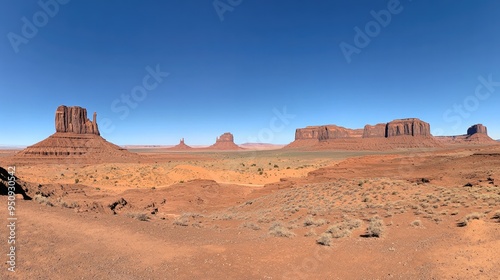 © Ti Studio, Fototapeta premium A panoramic view of Monument Valley, with towering red rock formations rising from the flat desert floor -
